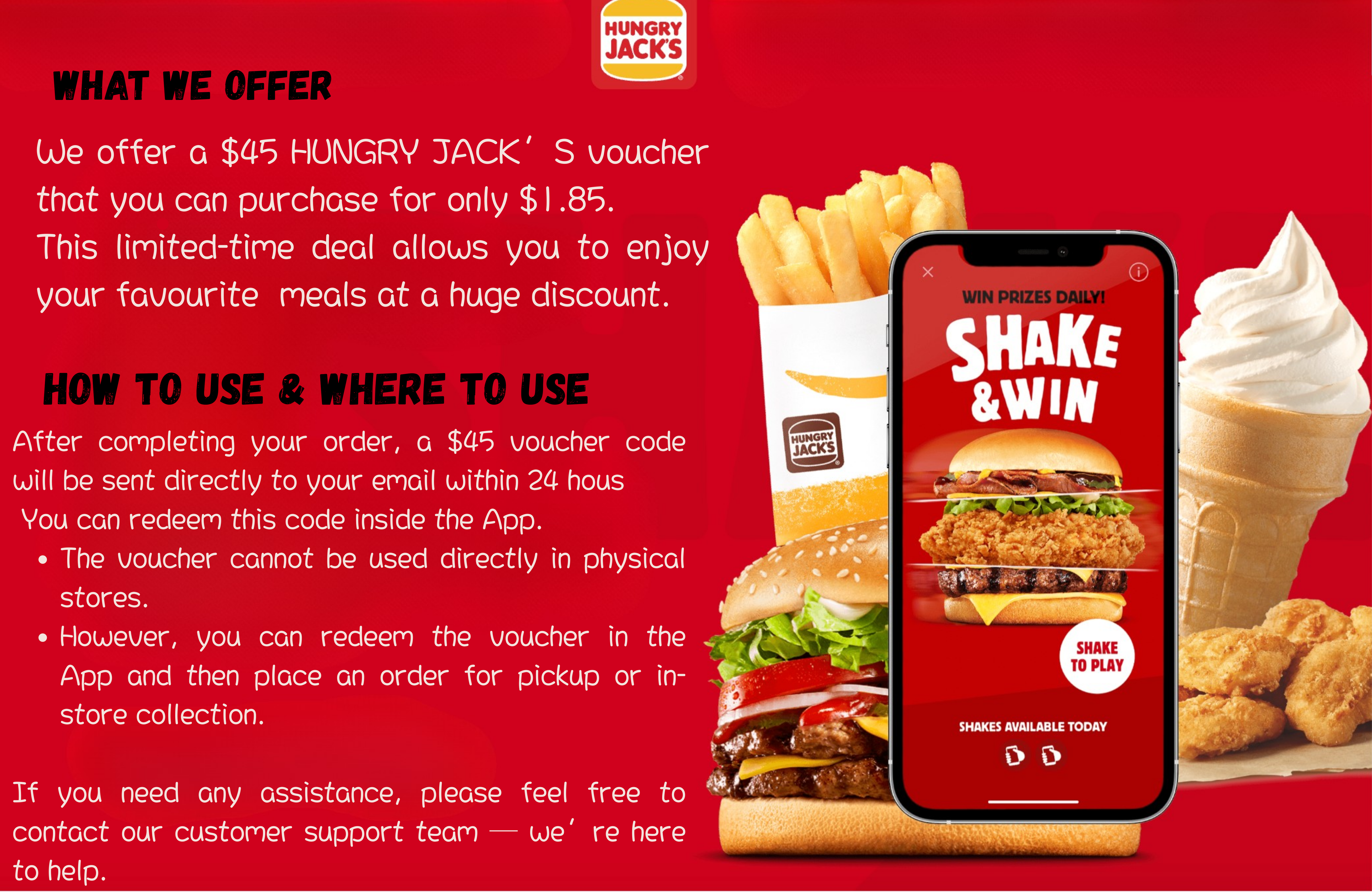 Fantastic value! My $45 Hungry Jack’s voucher arrived quickly and worked perfectly at checkout. Saved a ton on lunch. Highly recommend!