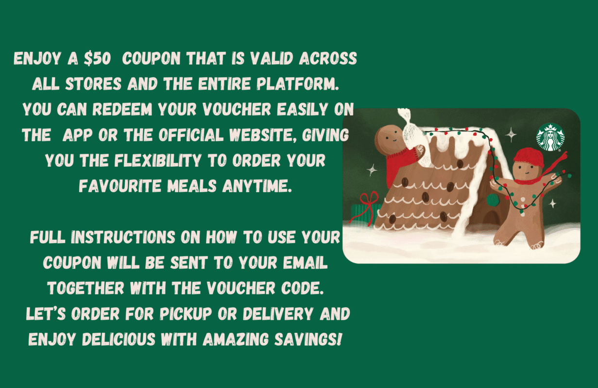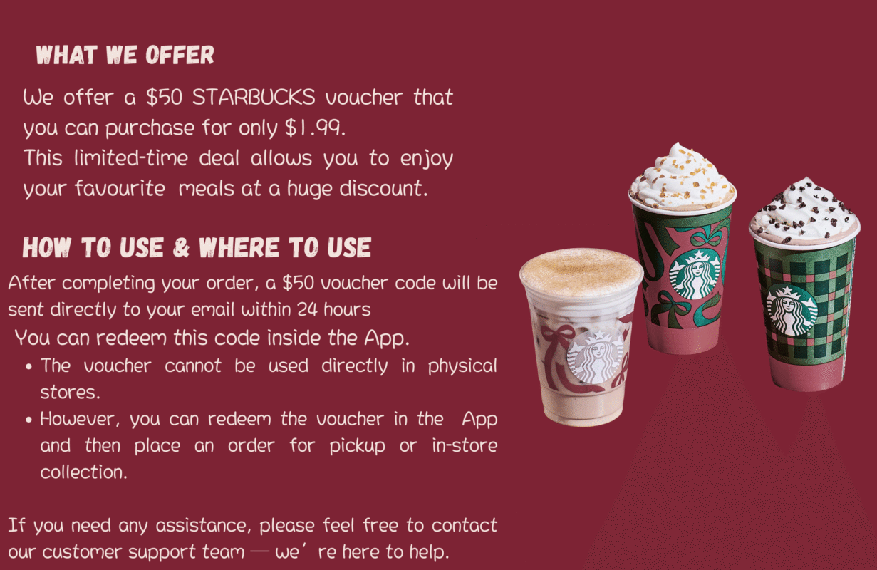 Get a $50 Starbucks voucher for just $1.99 and enjoy huge savings on your favourite drinks and treats. Redeem easily through the Starbucks App or website. Your coupon code and full instructions will be delivered directly to your email within 24 hours